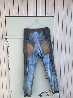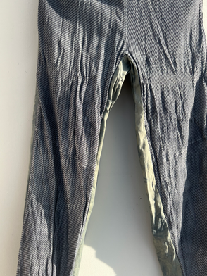 These trousers are crafted from leftover fabrics, featuring a blend of dark grey, textured panels and muted, greenish-grey sections. The cold dye process creates a beautiful, subtle tie-dye effect, giving the fabric depth and character. With an elastic waistband and drawstrings for a comfortable fit, and elastic cuffs at the ankles, the Zirkna trousers combine relaxed functionality with an artistic edge. The intricate stitching details and contrasting fabric textures make this piece truly stand out.