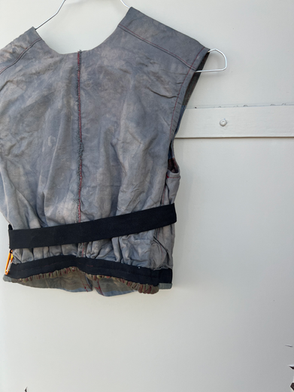 This one-of-a-kind piece, crafted from leftover fabrics, combines teal and grey hues with a cold dye finish. The asymmetrical cut and distinctive details, including drawstrings + carabiners, offer a dynamic and adaptable style. Whether you’ve seen it before or for the first time, this top continues to be a wearable work of art.